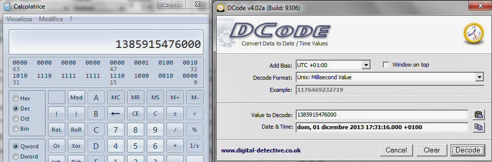 01 42 AE FF E8 20 e 01 42 AF 1F BA 5F e li traduciamo in decimale con la calcolatrice e poi convertiamo il numero in Unix Milliseconds Time, infatti qui il timestamp è in millisecondi e non in secondi, poi impostiamo DCode in UTC+1 (siamo in Italia in ora solare quindi UTC+1).